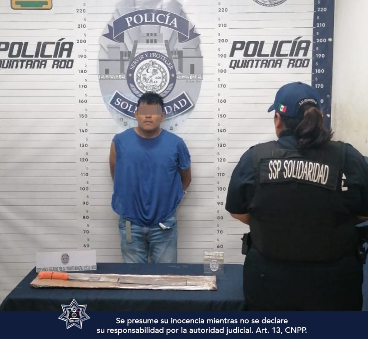 Playa del Carmen, Solidaridad.- Policías de la Secretaría de Seguridad Pública y Tránsito Municipal de Solidaridad aseguraron a un sujeto señalado de agredir y lesionar a dos personas con un machete, en la colonia Colosio.