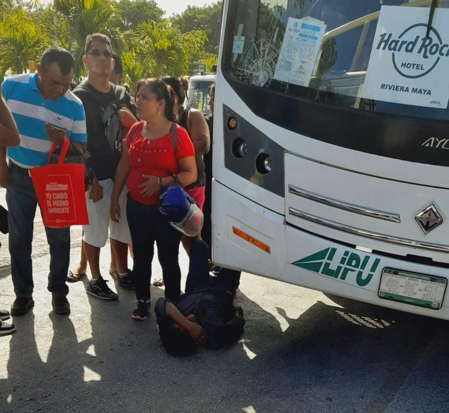 Playa del Carmen.- Un hombre, aparentemente un albañil, terminó entre las llantas de un autobús de personal de la empresa LIPU, luego que esta unidad lo embistiera esta tarde en Puerto Aventuras.