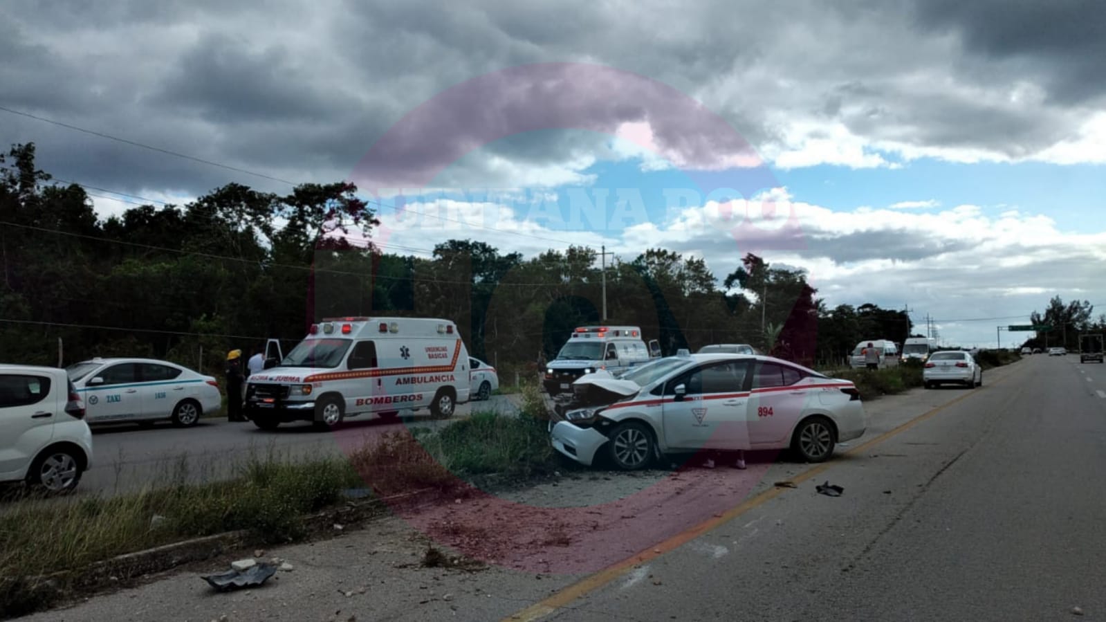 Cuatro vehículos están involucrados en un accidente que se registró sobre la carretera federal Tulum-Playa del Carmen, cerca del entronque al ejido Jacinto Pat, los reportes oficiales informan sobre dos personas lesionadas, conductores de los vehículos involucrados según información preliminar.
