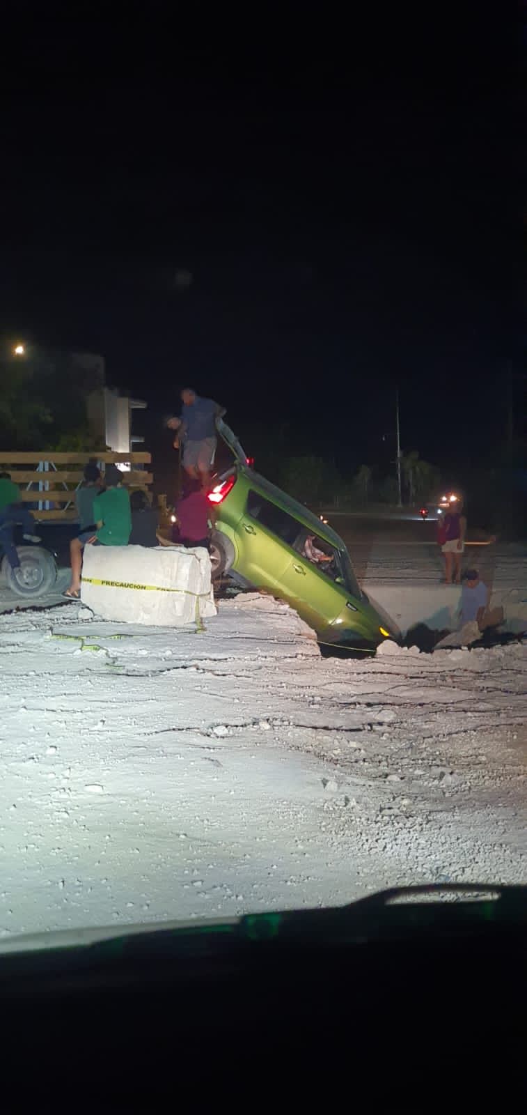 Tulum.- La noche de este lunes un automóvil cayó en una zanja, que aparentemente fue abierta para trabajos de drenaje, en la entrada del fraccionamiento Las Palmas de esta ciudad.