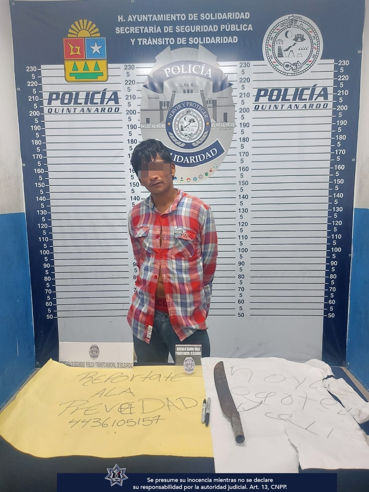 De inmediato los oficiales dieron alcance a quien se identificó como Alejandro “N” de 24 años de edad, originario de Tabasco, quien tenía en su posesión un machete y dos cartulinas de las cuales una tiene la leyenda “repórtate a la prevedad 4436105157”.