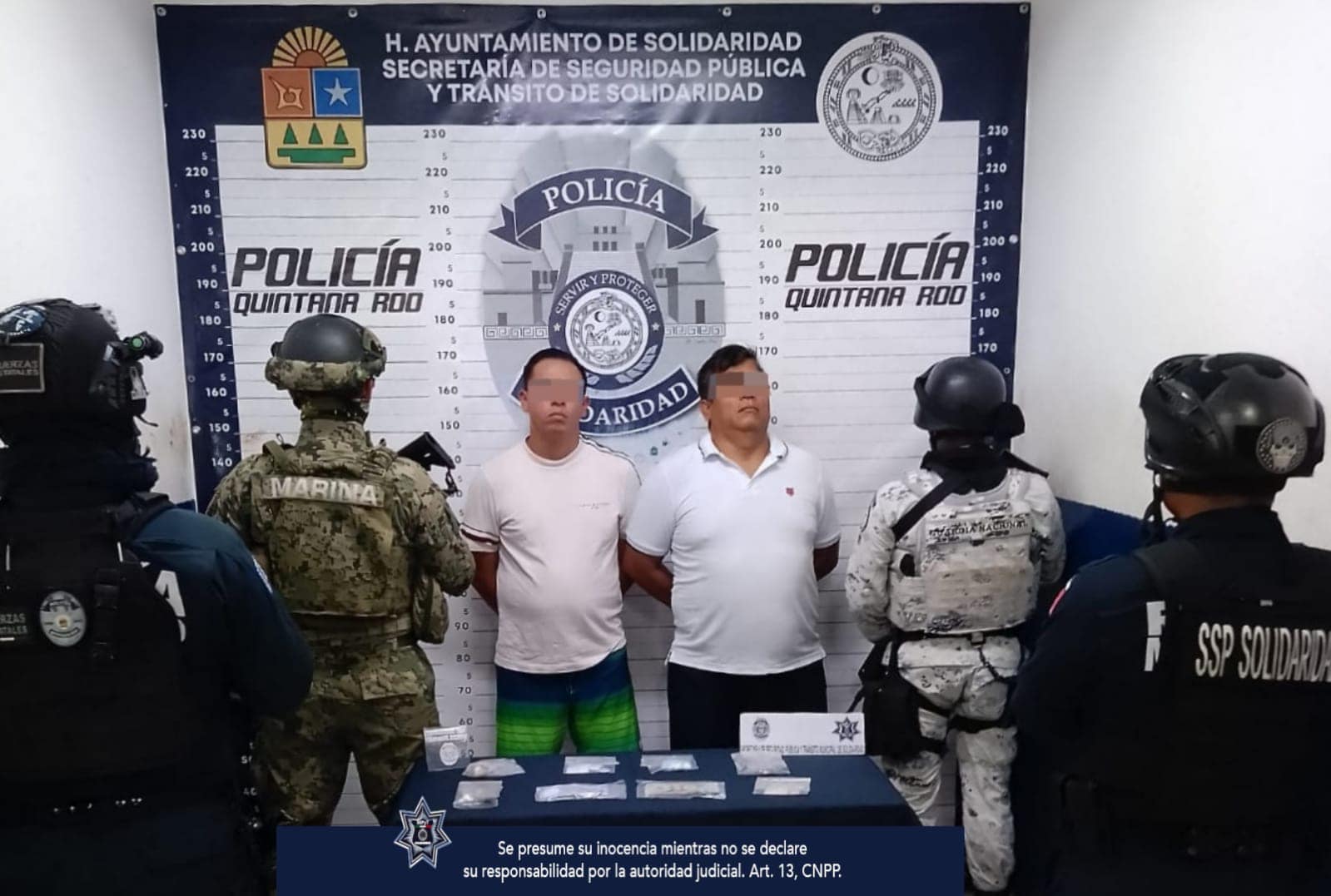 PLAYA DEL CARMEN.- Policías de la Secretaría de Seguridad Pública y Tránsito Municipal de Solidaridad, aseguraron a dos sujetos en posesión de posibles narcóticos y dinero en efectivo.