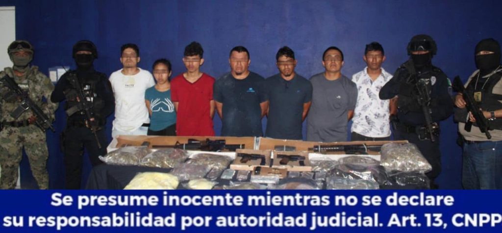 La Secretaría de Seguridad Pública en colaboración con la Fiscalía General del Estado de Quintana Roo logró la detención de Gustavo “N” de 27 años, Abel “N” de 26 años, Irving “N” de 33 años, David “N” de 21 años, Jesús “N” de 25 años, Geiner “N” de 42 años y Merari “N” de 24 años, por su probable participación en delitos contra la salud y Violación a la Ley Federal de Armas de Fuego de Uso Exclusivo, en Benito Juárez.
