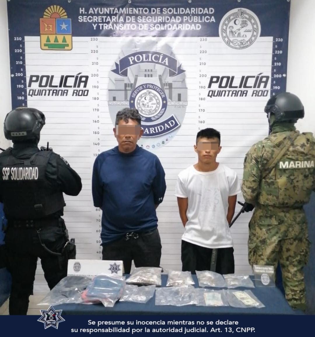 Playa del Carmen, Solidaridad.- Durante un recorrido de vigilancia conjunto en la colonia irregular In House, policías de la Secretaría de Seguridad Pública y Tránsito Municipal de Solidaridad y elementos de la SEMAR, aseguraron a dos sujetos y mas de 150 envoltorios que contenían posibles narcóticos como marihuana, cocaína, cristal y piedra.