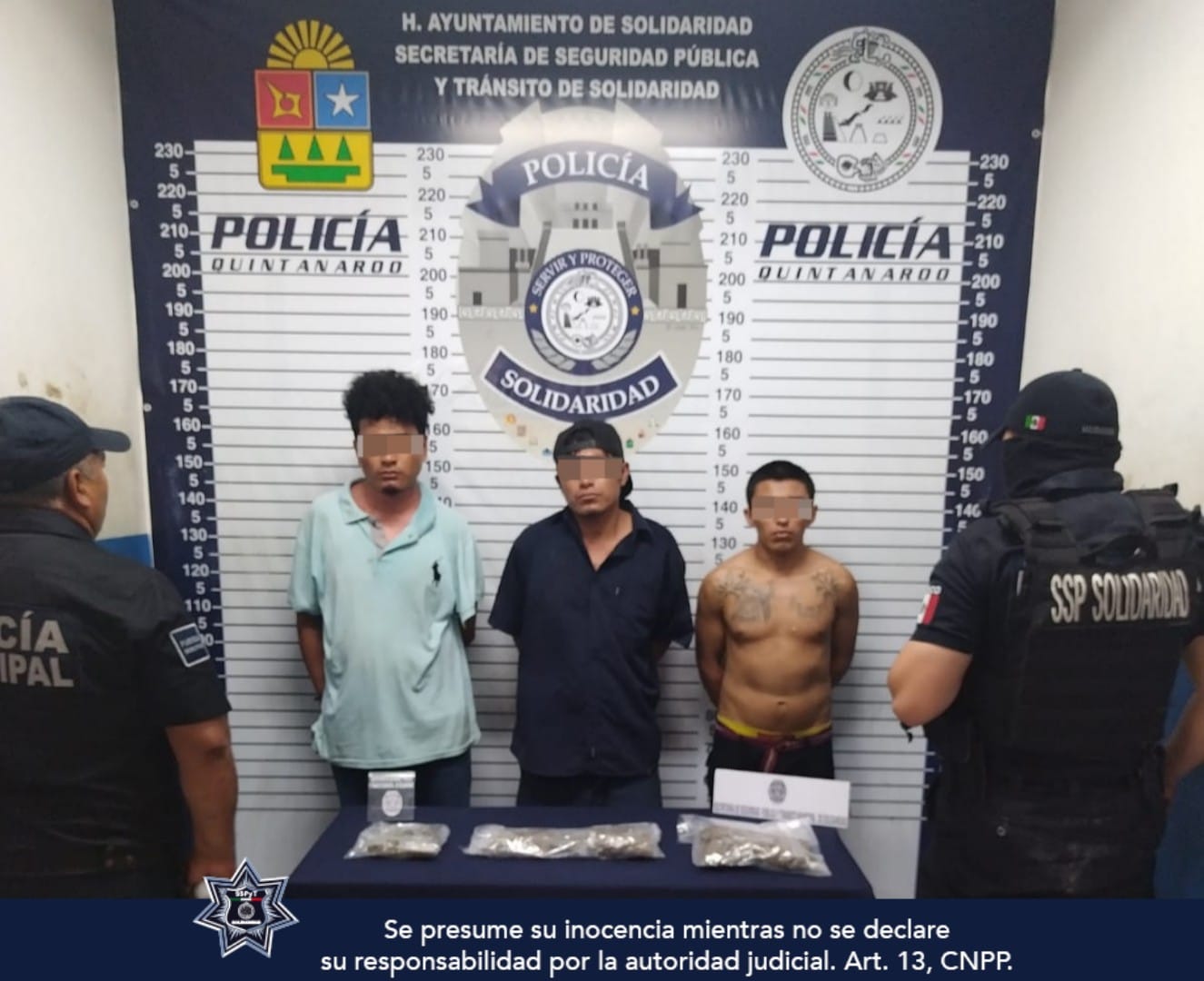 Playa del Carmen, Solidaridad.- Policías de la Secretaría de Seguridad Pública y Tránsito Municipal de Solidaridad aseguraron a 3 sujetos en posesión de posible marihuana durante un operativo de vigilancia en la colonia Colosio.