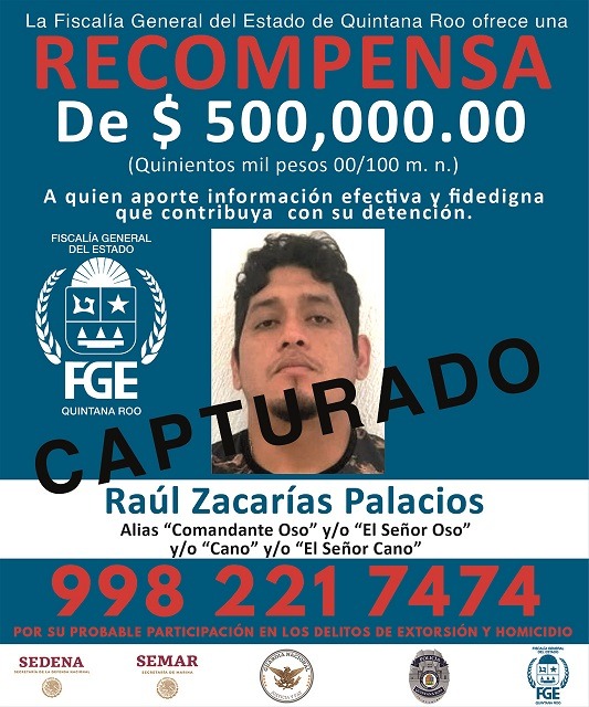 El imputado fue capturado en Pachuca, Hidalgo y cuenta con una ficha de recompensa de 500 mil pesos a quien aportara datos fidedignos para su ubicación y captura, misma que no será pagada, ya que fue localizado gracias a labores de inteligencia tradicional y tecnológica por parte de las autoridades de Hidalgo y Quintana Roo.