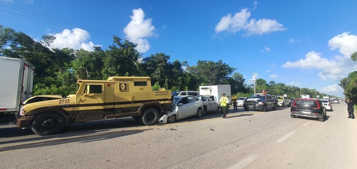 En esta “carambola” quedaron involucrados un camión de traslado de valores de la empresa Cometra, así como dos camionetas de refrigeración y un automóvil particular, un Chevrolet Cavalier.