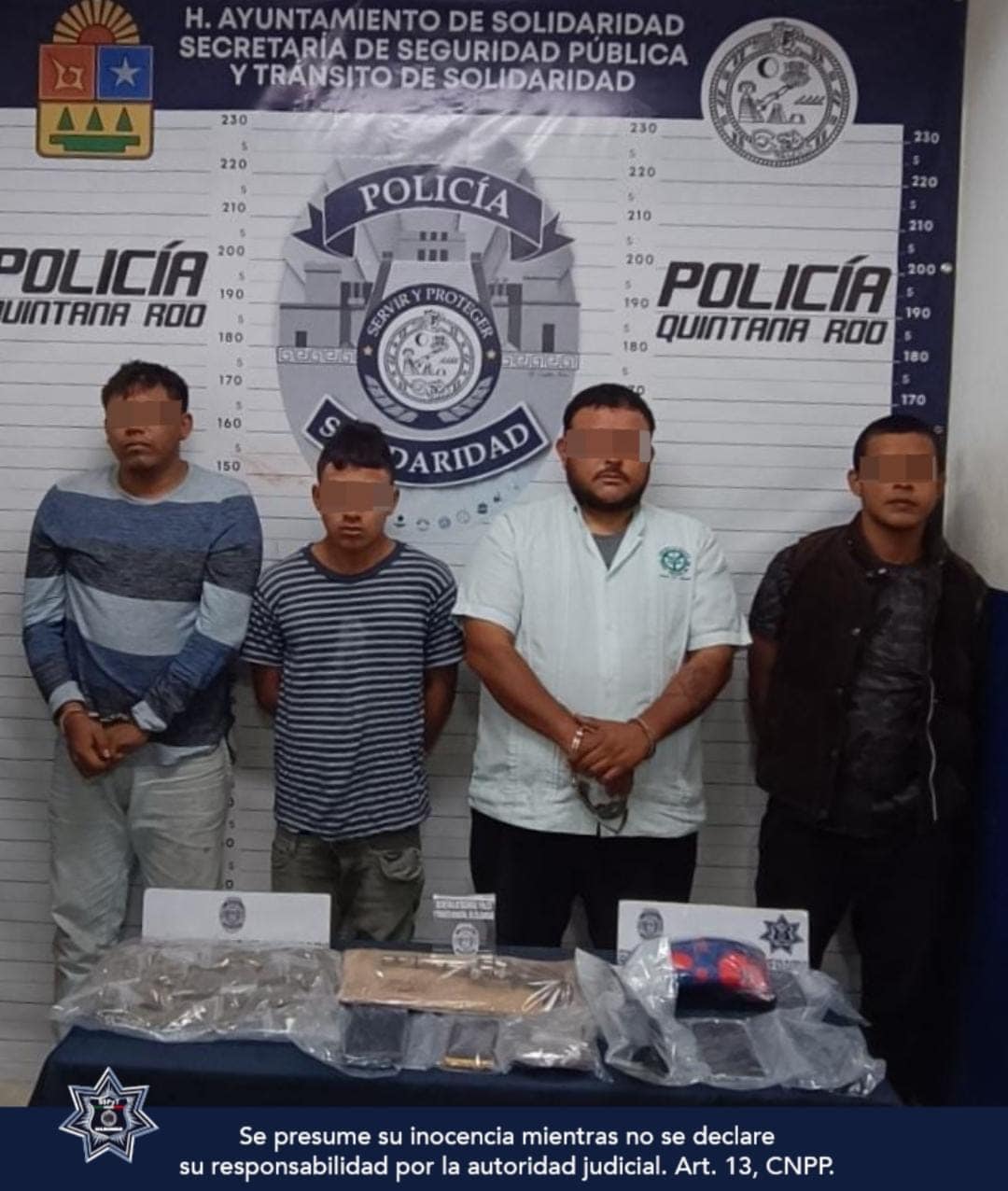 Policías de la Secretaría de Seguridad Pública y Tránsito Municipal de Solidaridad aseguraron a cuatro sujetos, un arma de fuego, narcóticos y un radio de comunicación, luego de sorprenderlos intercambiando posible droga.