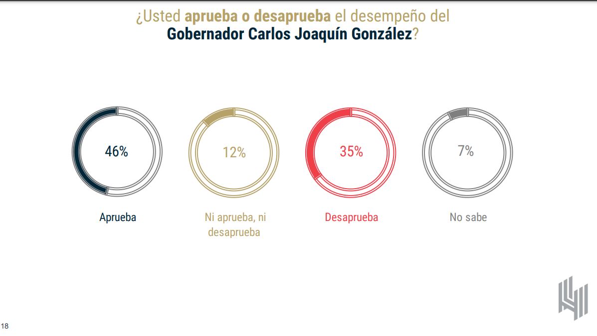 La calificación del trabajo del gobernador Carlos Joaquín González, se dio de la siguiente forma: un 8% de personas le dio calificación de 0, un 18% lo calificó entre 1 a 5, el 30% le dio de 6 a 7, el 33% le dio entre 8 y 9 y sólo un 2% lo calificó con 10, para alcanzar un promedio de 6.2.