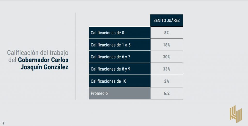 La calificación del trabajo del gobernador Carlos Joaquín González, se dio de la siguiente forma: un 8% de personas le dio calificación de 0, un 18% lo calificó entre 1 a 5, el 30% le dio de 6 a 7, el 33% le dio entre 8 y 9 y sólo un 2% lo calificó con 10, para alcanzar un promedio de 6.2.