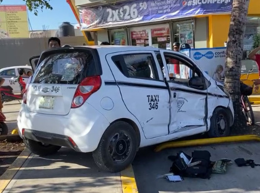 Derivado al fuerte impacto el conductor del taxi perdió el control hasta terminar por impactar contra una palmera ubicado en el estacionamiento del Oxxo