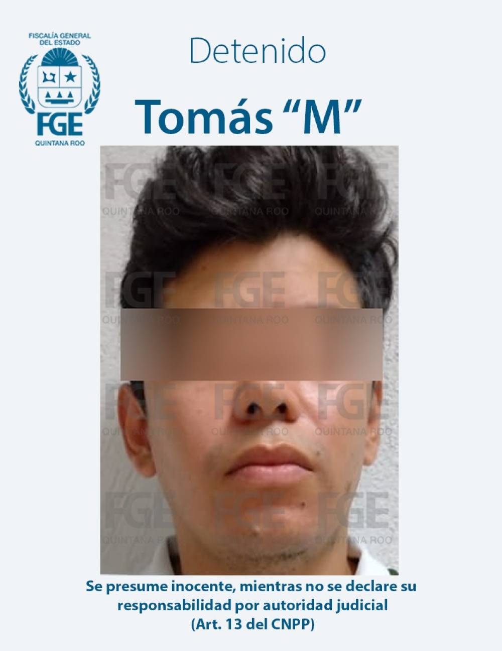 Puerto Morelos, Quintana Roo. La Fiscalía General del Estado, informa que fue cumplimentada la orden de aprehensión en contra de Tomás “M”, por su probable participación en el delito de violación en agravio de una víctima de identidad reservada.