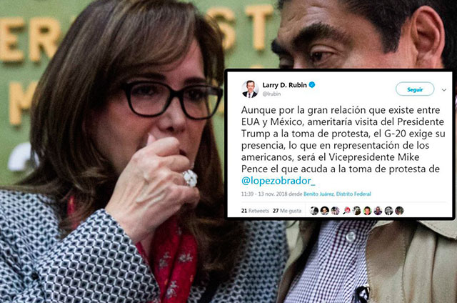 Larry Rubin señaló en su cuenta de Twitter que: ‘Aunque por la gran relación que existe entre EUA y México, ameritaría visita del Presidente Trump a la toma de protesta, el G-20 exige su presencia, lo que en representación de los americanos, será el Vicepresidente Mike Pence el que acuda a la toma de protesta de @lopezobrador_”
