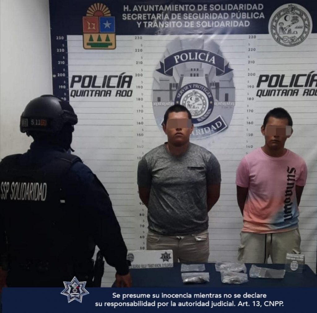 Durante un recorrido de seguridad y prevención de delitos, policías de la Secretaría de Seguridad Pública y Tránsito Municipal de Solidaridad aseguraron a dos sujetos y posibles drogas como cristal, piedra y marihuana en el fraccionamiento La Guadalupana.