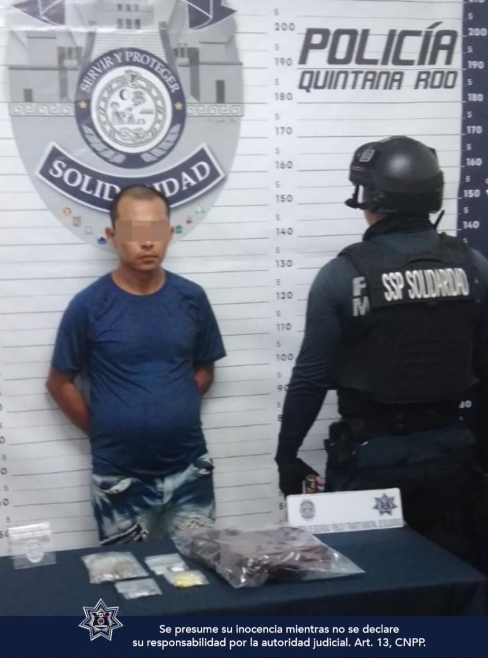 Playa del Carmen, Solidaridad.- Durante el operativo permanente de prevención de delitos, policías de la Secretaría de Seguridad Pública y Tránsito Municipal realizaron el aseguramiento de una persona en posesión de lo que parece marihuana, cristal, cocaína y piedra.
