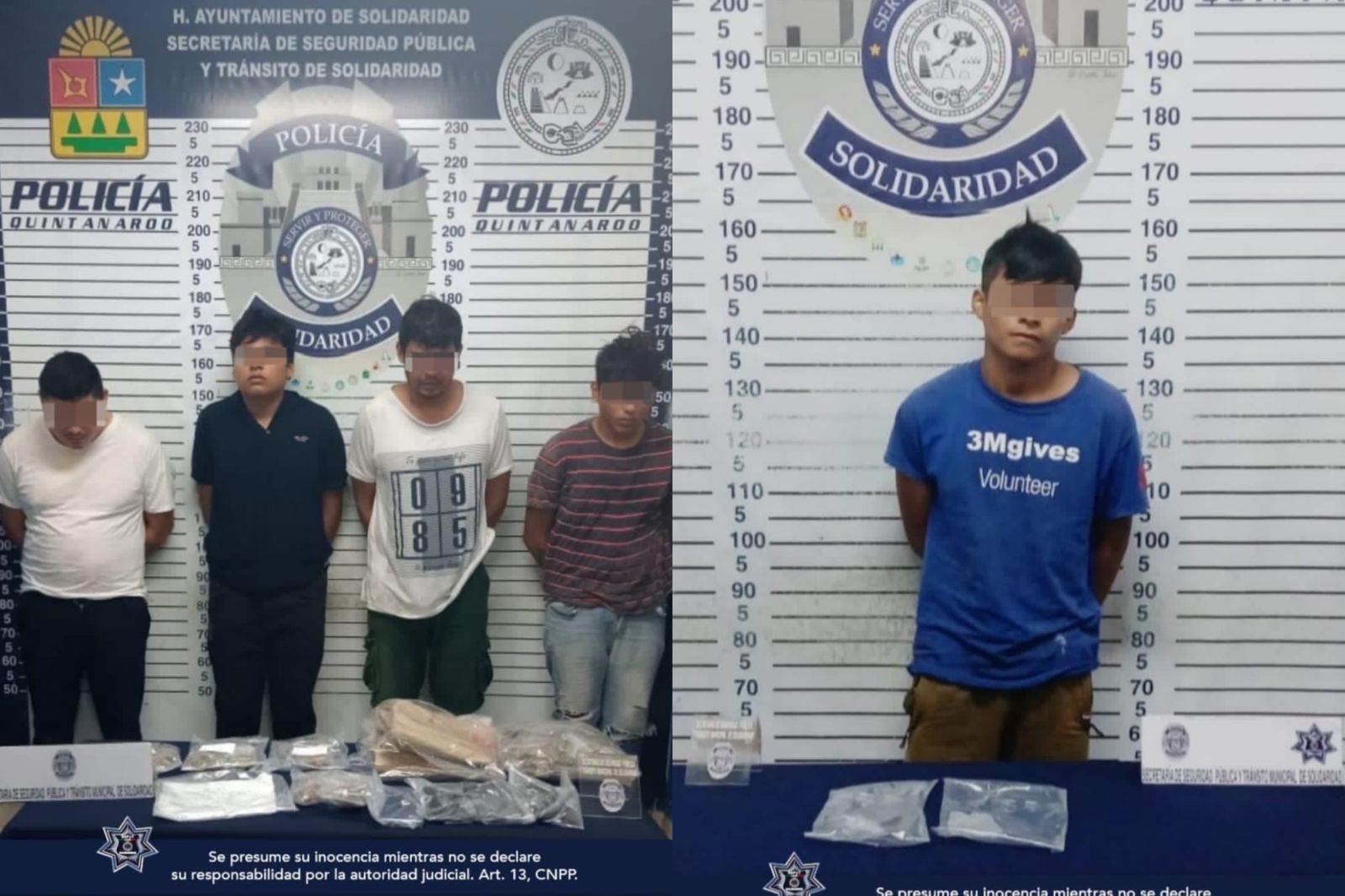 SOLIDARIDAD.- Cinco personas fueron aseguradas en posesión de posibles narcóticos en dos hechos distintos, como resultado de las labores permanentes de vigilancia de la Secretaría de Seguridad Pública y Tránsito Municipal de Solidaridad.