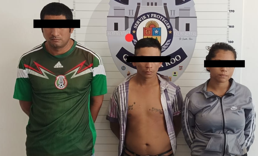 CANCÚN.- Policías de Quintana Roo lograron la detención de dos masculinos y una fémina que fueron identificados como Josué R.A., de 38 años de edad, originario de Veracruz; Marcos S.G., de 26 años, originario de Tabasco; y Ana R.R.G., de 22 años, originaria de la Ciudad de México.