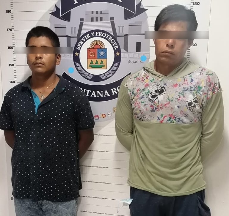 Se trata de dos hombres que dijeron llamarse Edgar “N” de 32 años de edad y A.J.S.Q., de 17 años, quienes fueron detenidos cuando oficiales que encontraban en su recorrido de prevención y vigilancia, recibieron un reporte del 911, sobre detonaciones de arma de fuego en la región 247, manzana 20.