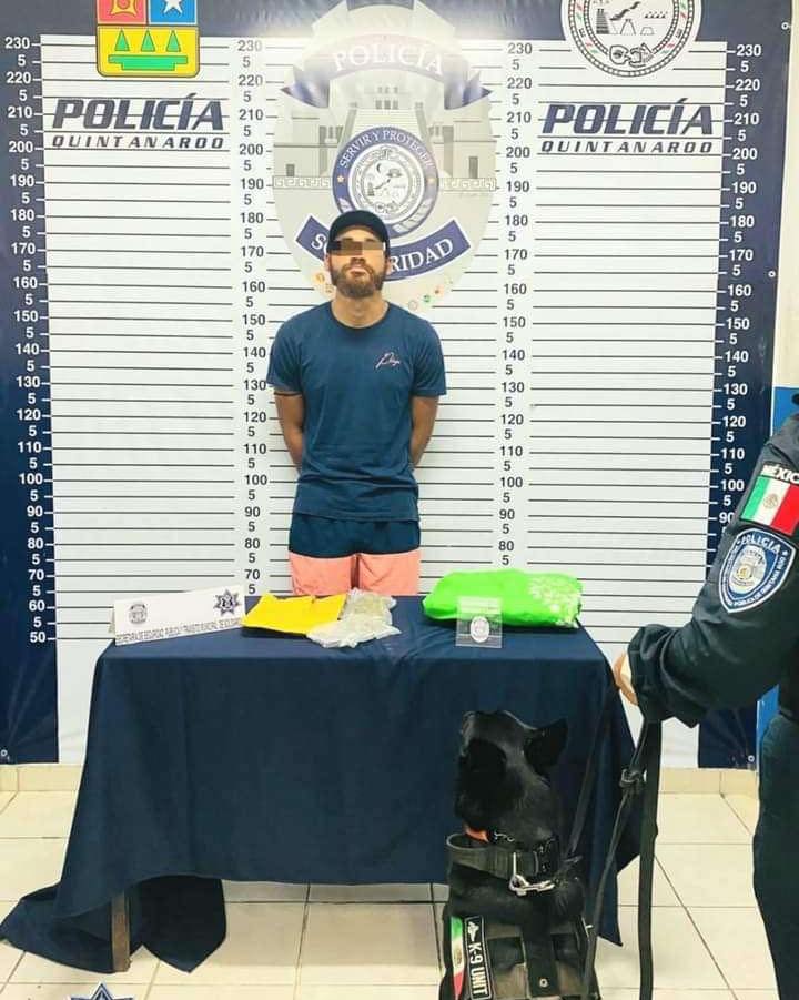 PLAYA DEL CARMEN.- Un extranjero de origen estadounidense fue asegurado por posesión de posible marihuana por la Unidad Canina de la Secretaría de Seguridad Pública y Tránsito Municipal de Solidaridad.