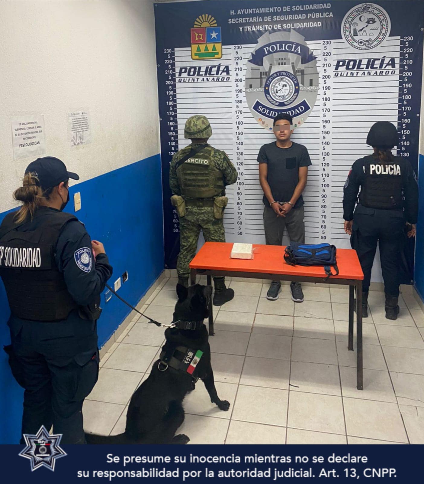 La posible droga fue ubicada con apoyo del binomio canino de la Unidad K9. El sujeto fue asegurado y puesto a disposición de la Fiscalía General de la República por la posible comisión de delitos contra la salud.