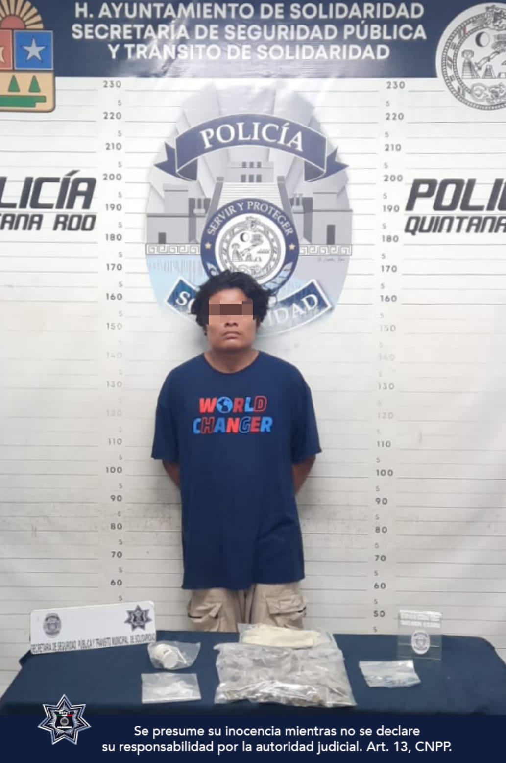 PLAYA DEL CARMEN.- En rápida respuesta a un auxilio en la colonia irregular In House, la Policía Municipal de Solidaridad aseguró más de 70 dosis de posibles drogas y al sujeto señalado de ofrecerlas.