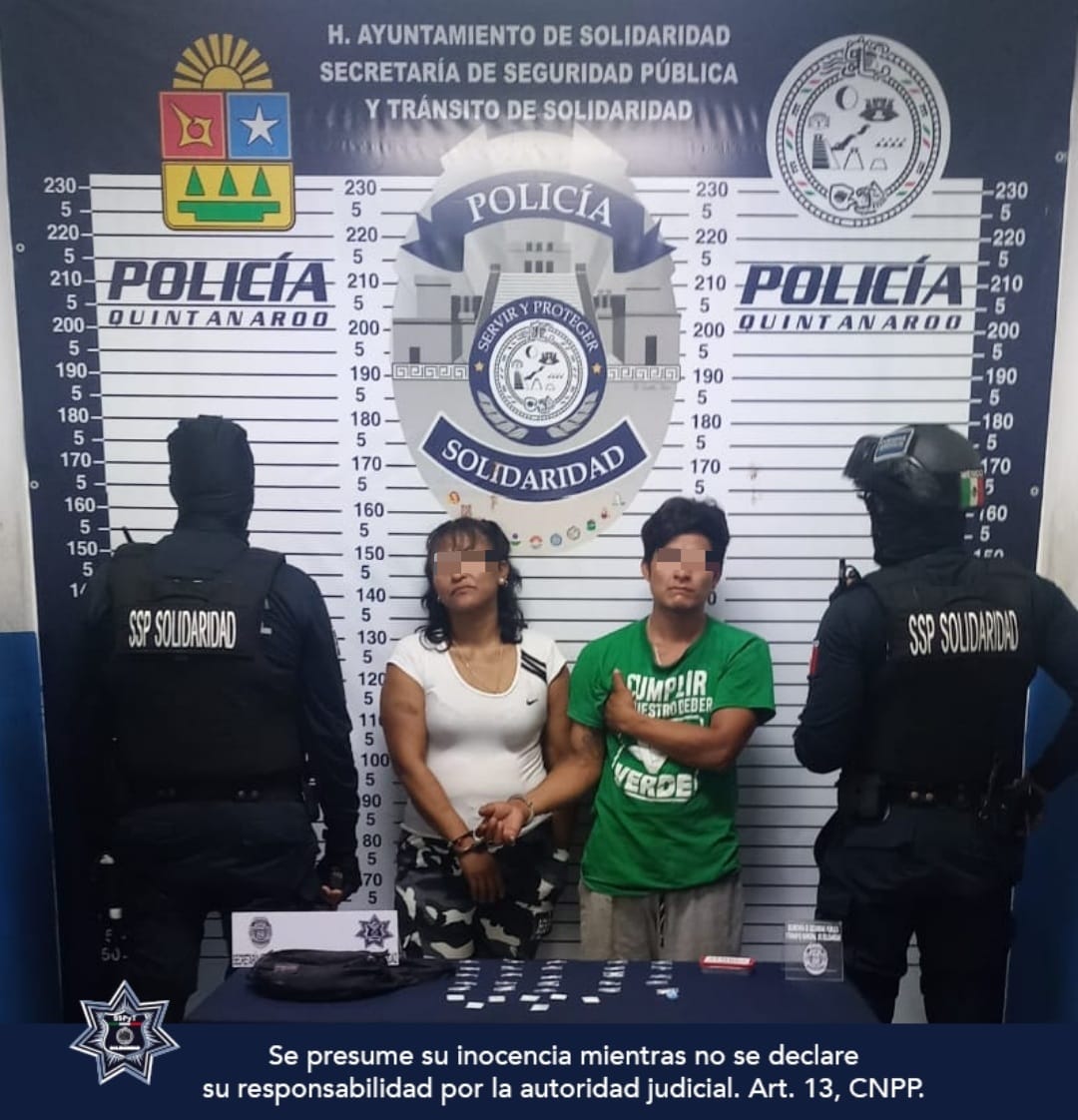 Playa del Carmen.- Un hombre y una mujer fueron asegurados en posesión de 33 dosis de posibles narcóticos por policías de la Secretaría de Seguridad Pública y Tránsito Municipal de Solidaridad, en la colonia Colosio.