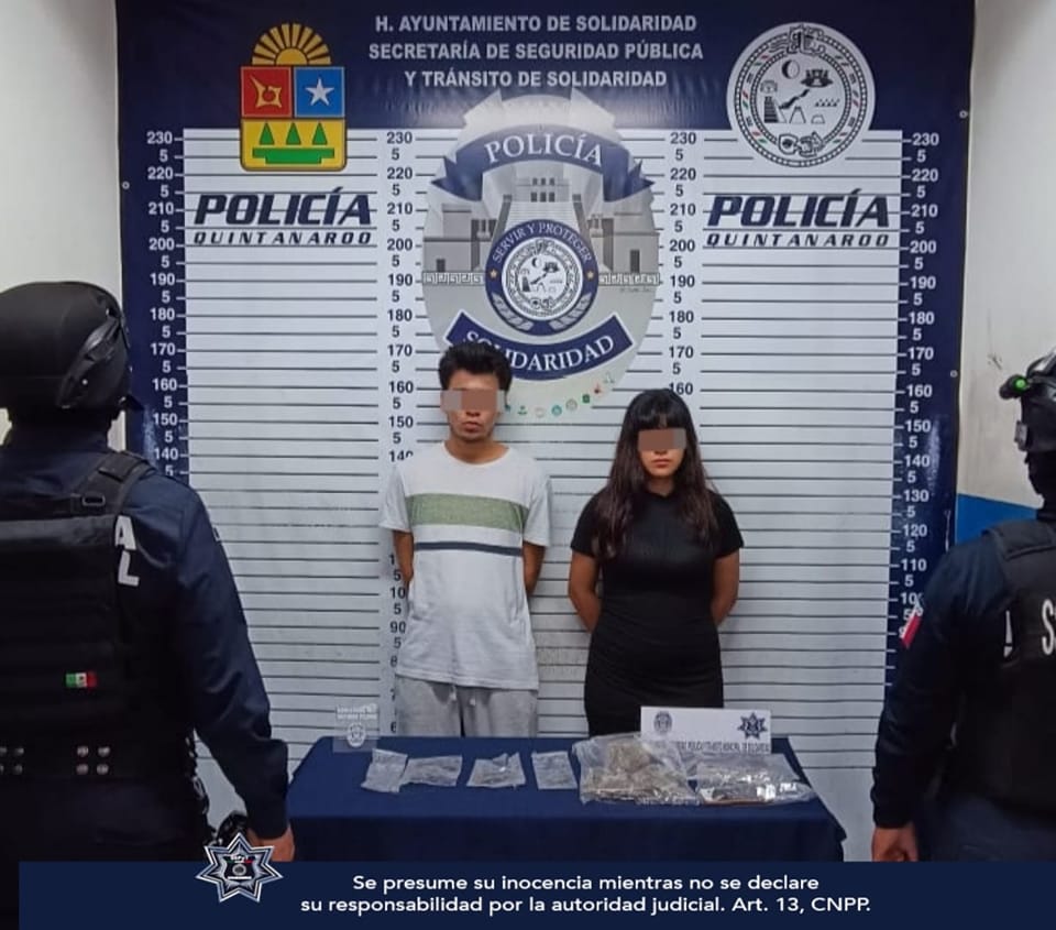 Playa del Carmen, Solidaridad.- Policías de la Secretaría de Seguridad Pública y Tránsito Municipal de Solidaridad aseguraron a un hombre y una mujer en posesión de 50 posibles dosis de narcóticos en el fraccionamiento Misión del Carmen.