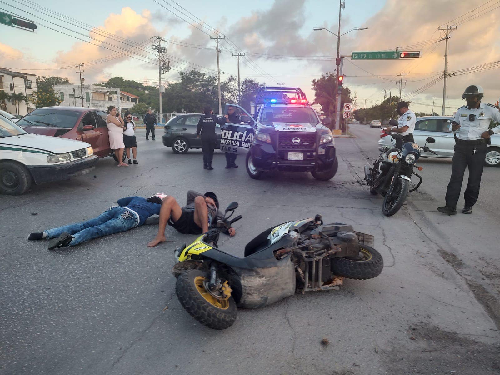 Sobre la Kabah iban un vehículo tipo Vento y una motocicleta y aunque trataron de frenar, fueron impactados por el taxi.