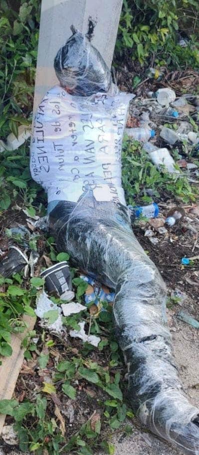 Las primeras investigaciones mencionan que se trata de un hombre que fue ejecutado, alrededor del cuerpo embolsado había una cartulina con mensaje.