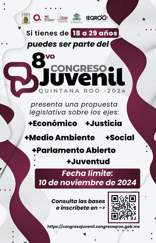 Chetumal.- La XVIII Legislatura del Estado de Quintana Roo, a través de la Comisión Ordinaria de Desarrollo Juvenil con Igualdad de Oportunidades, convoca a jóvenes de entre 18 y 29 años a participar en “El Octavo Congreso Juvenil del Estado de Quintana Roo”, que se llevará a cabo del 25 al 27 de noviembre de 2024.