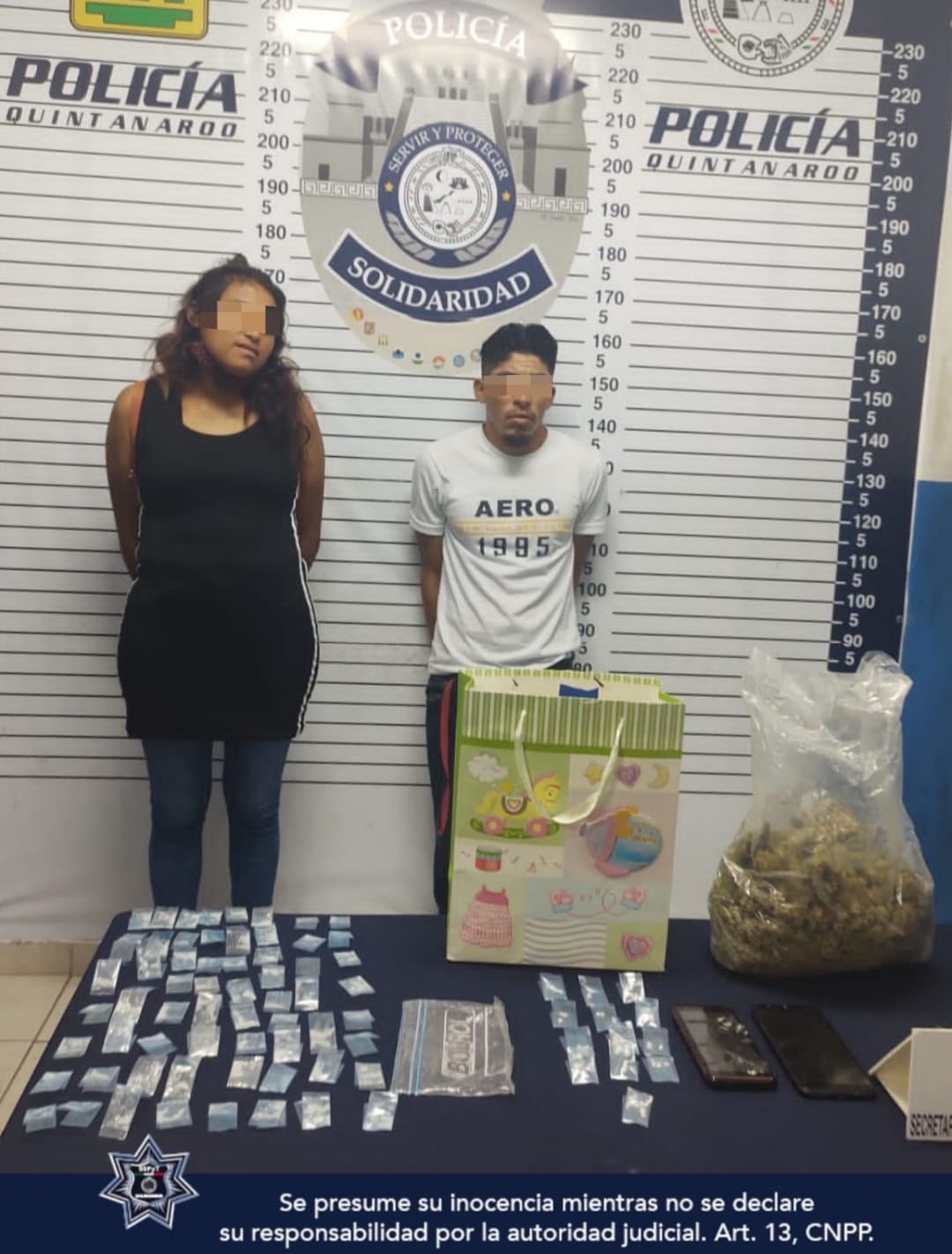 Playa del Carmen.- Dos personas fueron aseguradas por policías de la Secretaría de Seguridad Pública y Tránsito Municipal de Solidaridad en posesión de 75 dosis de posibles narcóticos y una bolsa grande con posible marihuana durante los operativos nocturnos para la prevención de delitos.