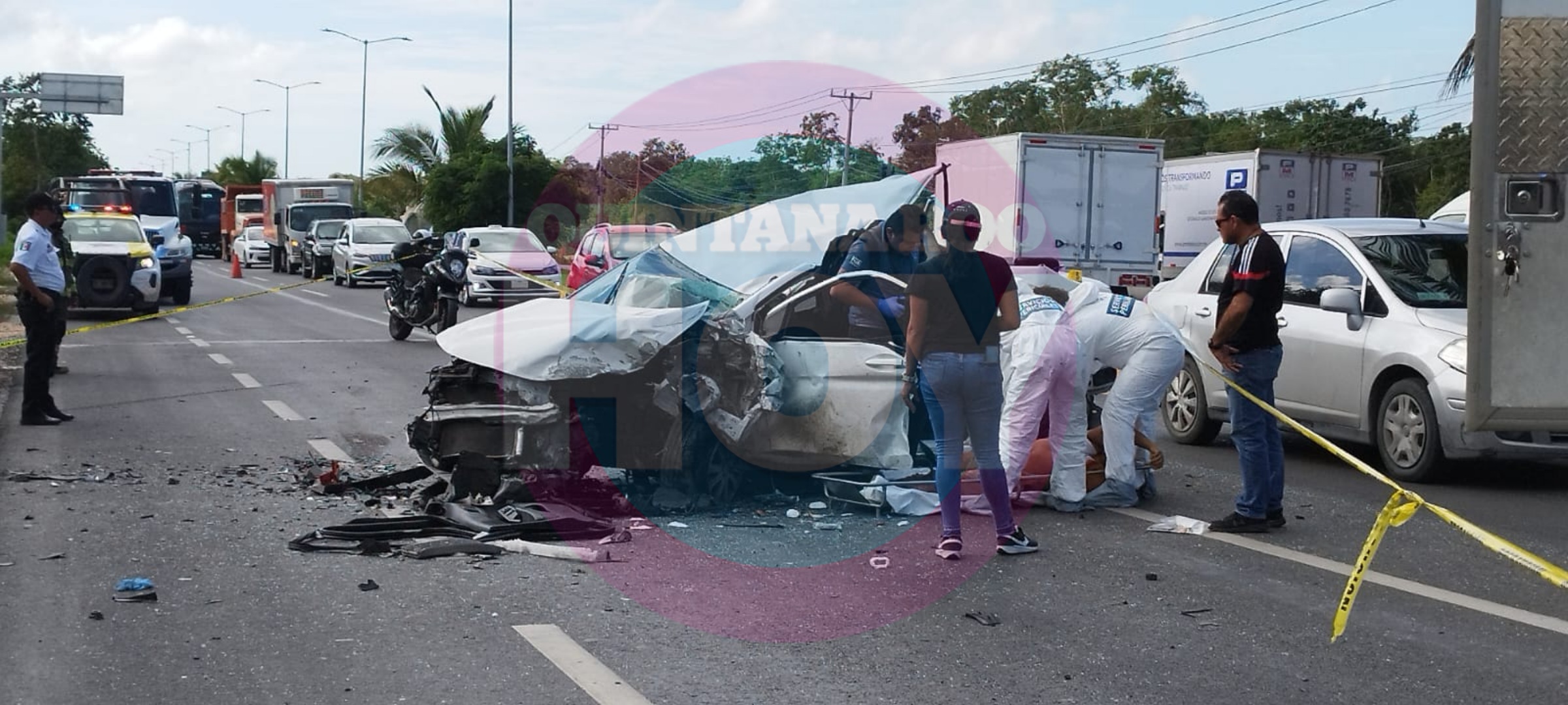 CANCÚN.- Por ir a exceso de velocidad sobre pavimento mojado, un automovilista se salió de su carril y se estrelló contra otro coche, en el puente de acceso (trébol) del Aeropuerto Internacional de Cancún, con saldo de una persona sin vida.