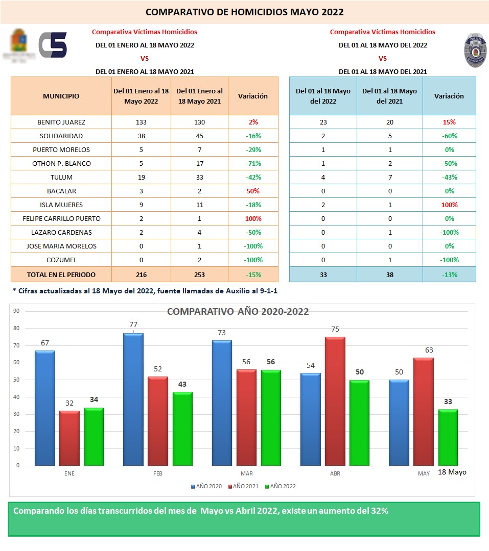 Un reporte estadístico público del Centro de Comando, Control, Cómputo, Comunicaciones y Contacto Ciudadano (C5) de Quintana Roo informa que, del 1 de enero al 18 de mayo del presente año, la Policía de Tulum disminuyó en 42% la incidencia de homicidios respecto al mismo periodo del año 2021.