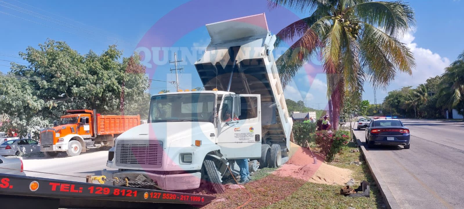 Playa del Carmen.- Un volquete, que transportaba polvo para las obras del Tren Maya, terminó descarrilado esta mañana sobre el camellón central, al evitar chocar contra un auto que invadió su carril, en la carretera federal 307.