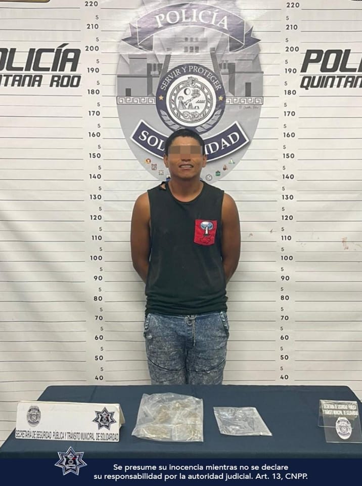 Policías de la Secretaría de Seguridad Pública y Tránsito Municipal de Solidaridad, aseguraron a un sujeto con 15 envoltorios que contenían posibles narcóticos como marihuana y crack, en el fraccionamiento Villas del Sol.