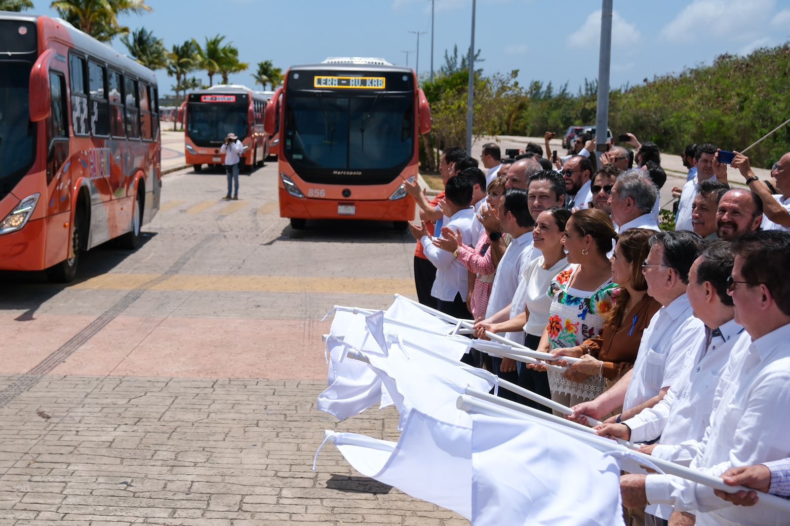 En este marco se dio el banderazo para poner en marcha el primer corredor que operará en la Avenida Kabah, con imagen unificada en 4 rutas, para la movilidad en la Zona Hotelera. Con la incorporación de estas nuevas unidades crece la flotilla 12%, mejorando sustancialmente la movilidad en este destino de clase mundial con ahorros de tiempo de traslado de hasta 20 minutos.