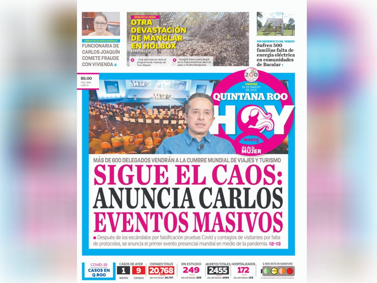 Al gobernador no le ha importado participar en eventos masivos en medio de la pandemia, mientras culpa a la población y a los turistas de la propagación del virus, descuidan la atención en antros, cantinas, bares, gimnasios, playas y hoteles los mínimos requisitos sanitarios de sana distancia para evitar los contagios. La secretaria de Turismo Marisol Vanegas, ha dicho que los visitantes son culpables por andar divirtiéndose, acudir a parques temáticos, playas y bares, algo absurdo si se toma en cuenta que a eso vienen los que disfrutan de los bellos escenarios naturales y confortables espacios de Quintana Roo.