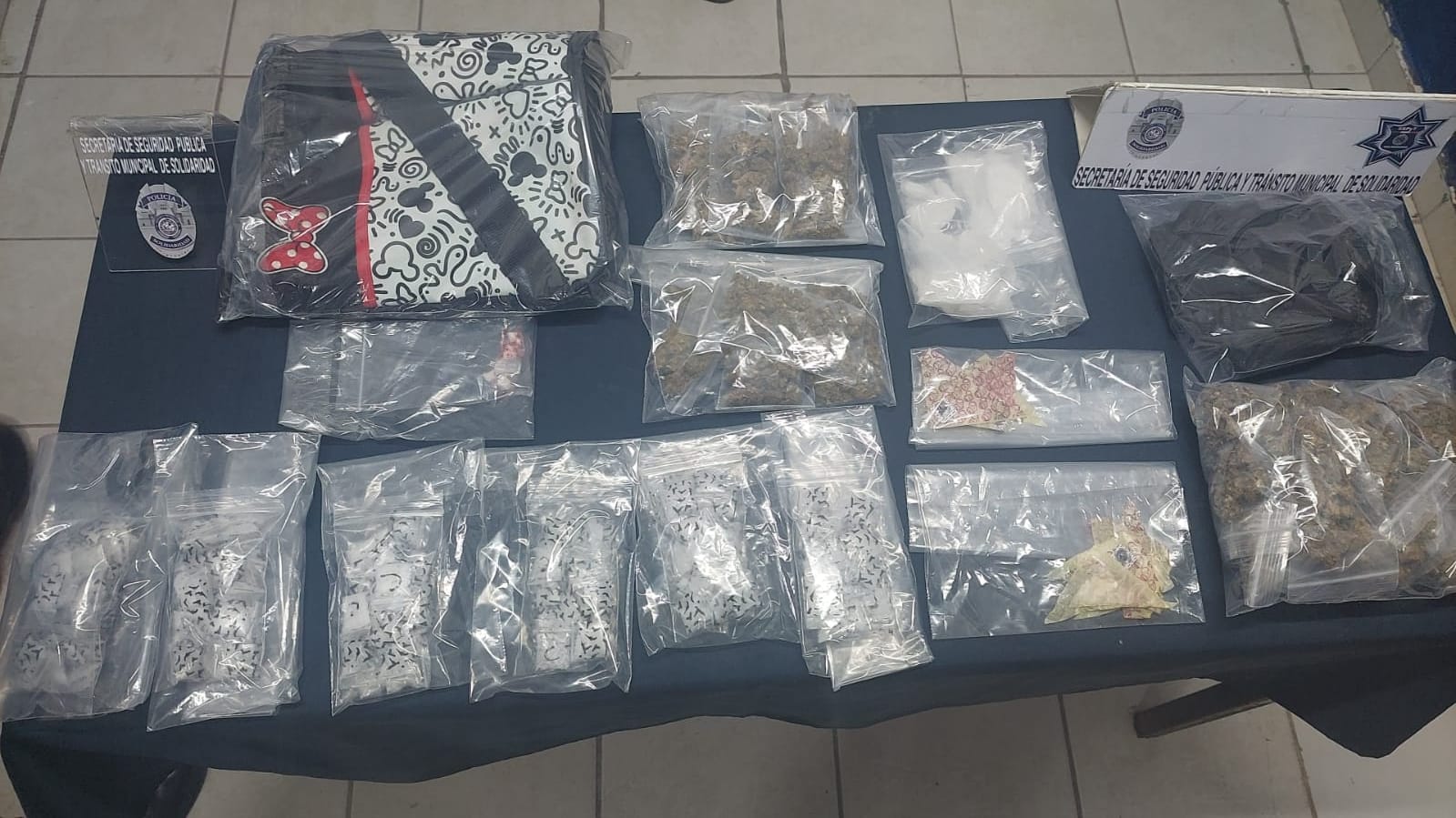 Tras una inspección les aseguraron 199 envoltorios con lo que parece metanfetamina, 24 con posible marihuana y 4 con posible cocaína, por lo que fueron asegurados y puestos a disposición de Fiscalía Especializada en Delitos contra la Salud en su Modalidad de Narcomenudeo.