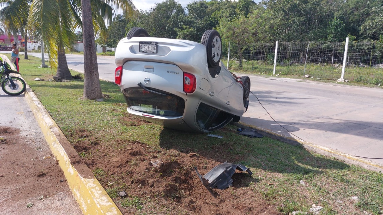 Playa del Carmen.- El conductor de un vehículo compacto modelo March, al ir a toda velocidad en dirección hacia el norte sobre la avenida 115, al pasar por la avenida Constituyentes y doblar la curva, dio banquetazo perdiendo el control de su unidad terminando volcado.