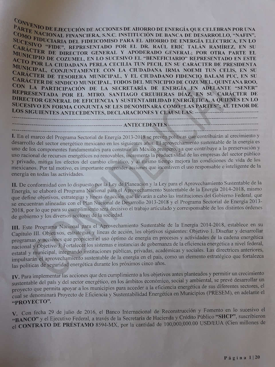 Perla Tun tenía todo preparado para que el cabildo autorizara el endeudamiento. Lo cual quedó de manifiesto en el párrafo II.5 de la página 5 del convenio: “Que el presente convenio ha sido autorizado por H. Ayuntamiento del Municipio de Cozumel en la Cuadragésima sesión ordinaria de Fecha__ de Junio del año dos mil dieciocho” .