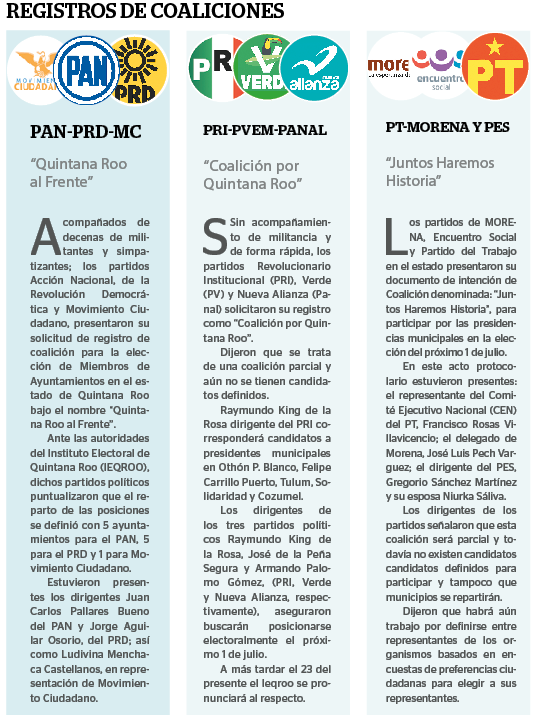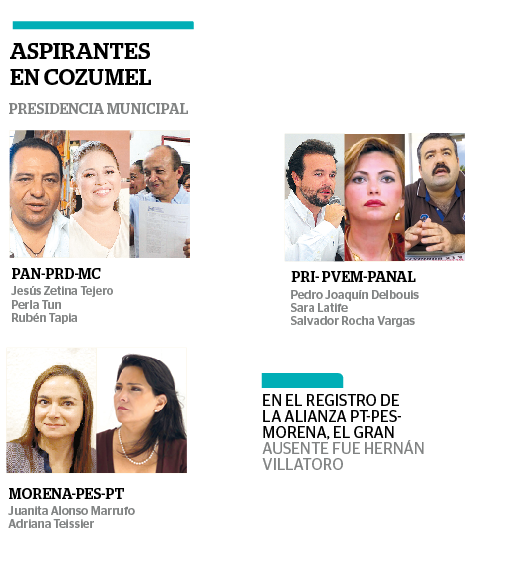 En la coalición Morena, PES y PT, aún está por definirse entre Juanita Alonso Marrufo y Adriana Teissier, aunque el PES de no ser elegida su candidata, iría solo en la isla de Cozumel.
