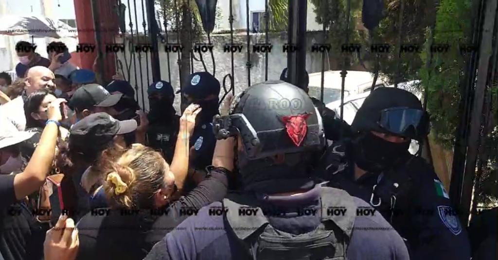 Alrededor de 60 personas entre ellos vecinos de la calle Ciénega de la Región 202 en el Fraccionamiento Haciendas real del caribe se unieron para evitar un desalojo, al lugar llegaron al menos nueve patrullas.