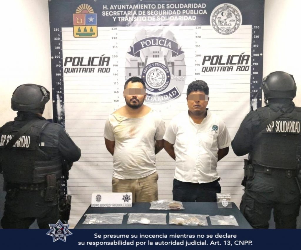 Policías de la Secretaría de Seguridad Pública y Tránsito Municipal de Solidaridad aseguraron a dos sujetos y posibles drogas como piedra, cristal y marihuana en la colonia Ejido.