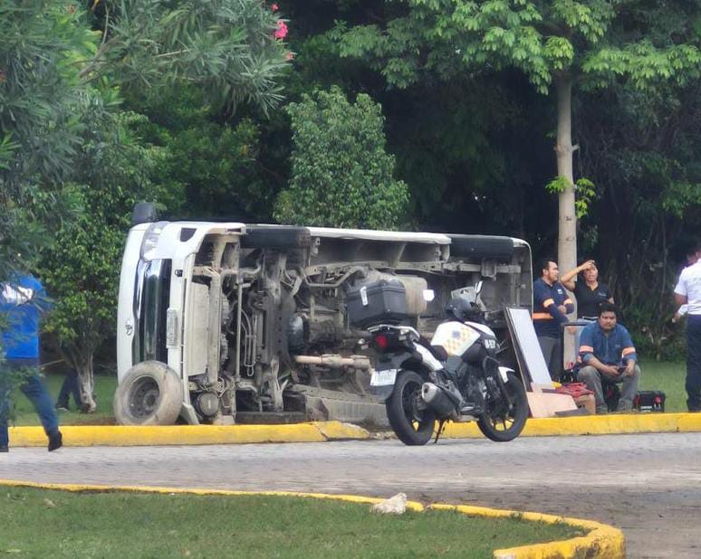 El incidente ocurrió alrededor de las 11:30 horas, cuando una camioneta Toyota Hiace circulaba sobre la avenida Xpuhil con dirección al Mercado 28. Al ingresar a la glorieta sin considerar las condiciones de la vía, el conductor perdió el control de la unidad.
