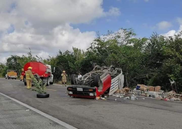 Chetumal.- Un camión tipo estaquitas que venía cargado de cerveza y abarrotes volcó de manera aparatosa en la carretera Cafetal-Mahahual, aunque de manera increíble el conductor quedó prácticamente ileso.