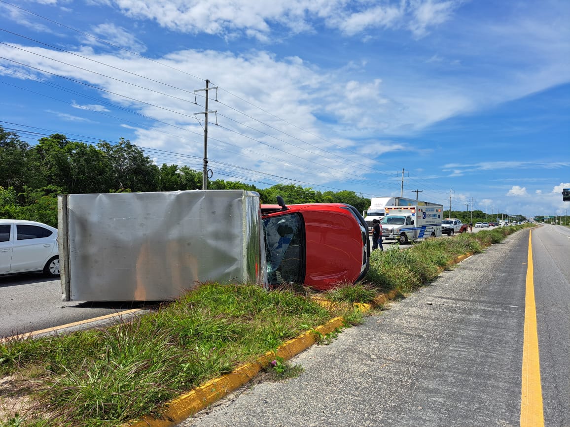 El conductor de una camioneta Nissan, NP 300, circulada de sur a norte, cuando a la altura del parque Xel-Ha el neumático derecho de la parte trasera estalló, por lo que perdió el control de la unidad.