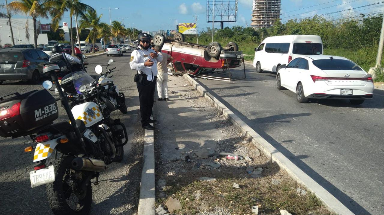 CANCÚN.- El conductor de un automóvil iba a velocidad extrema sobre el bulevar Colosio a la altura de una escuela privada, cuando perdió el control del volante y al chocar con la banqueta hizo que su unidad se volcara, por suerte no hubo otros carros involucrados, ni personas lesionadas de gravedad.