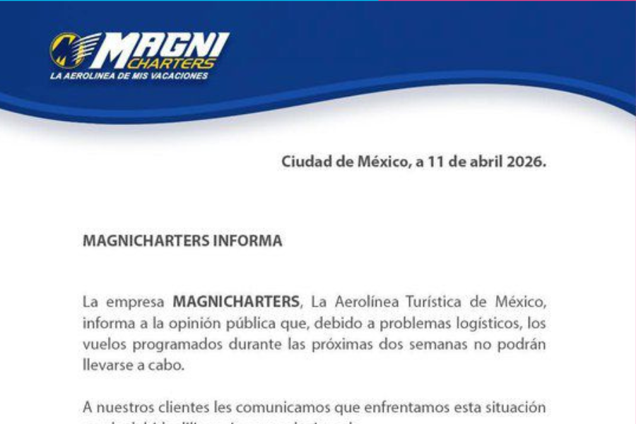 Cancún.-La aerolínea Magnicharters suspenderá sus vuelos durante dos semanas debido a problemas logísticos, informó el Grupo Aéreo Monterrey, generando afectaciones a pasajeros en distintos destinos turísticos del país.