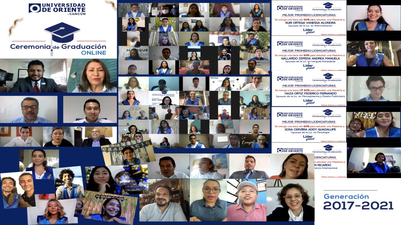 CANCÚN.- En días pasados la Universidad de Oriente campus Cancún se vistió de gala, ya que de manera virtual se realizó la ceremonia de graduación de la generación 2017-2021 de las licenciaturas en Administración, Arquitectura, Comercio Internacional, Comunicación, Derecho, Lenguas Extranjeras, Mercadotecnia & Diseño Publicitario y Psicología; sumando un total de 96 estudiantes egresados.