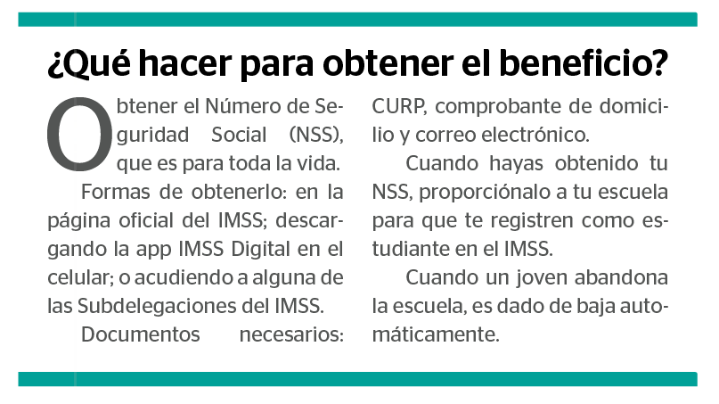 Los jóvenes tienen acceso a todos los servicios médicos del primer hasta tercer nivel de atención y por maternidad en el caso de las mujeres, al estar dentro de la cobertura del Seguro de Salud para Estudiantes del IMSS, que es totalmente gratuito para los alumnos de nivel medio y superior.